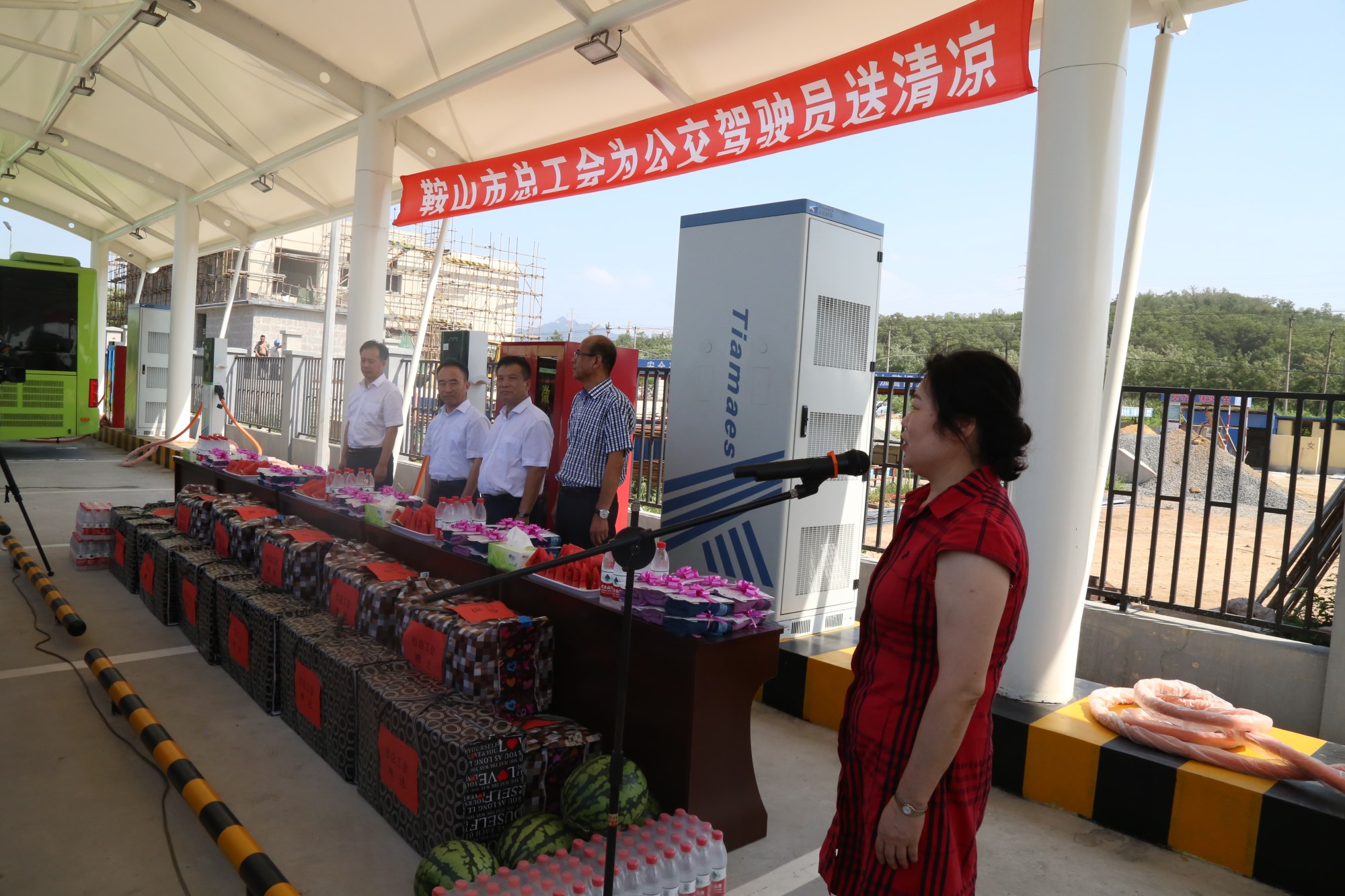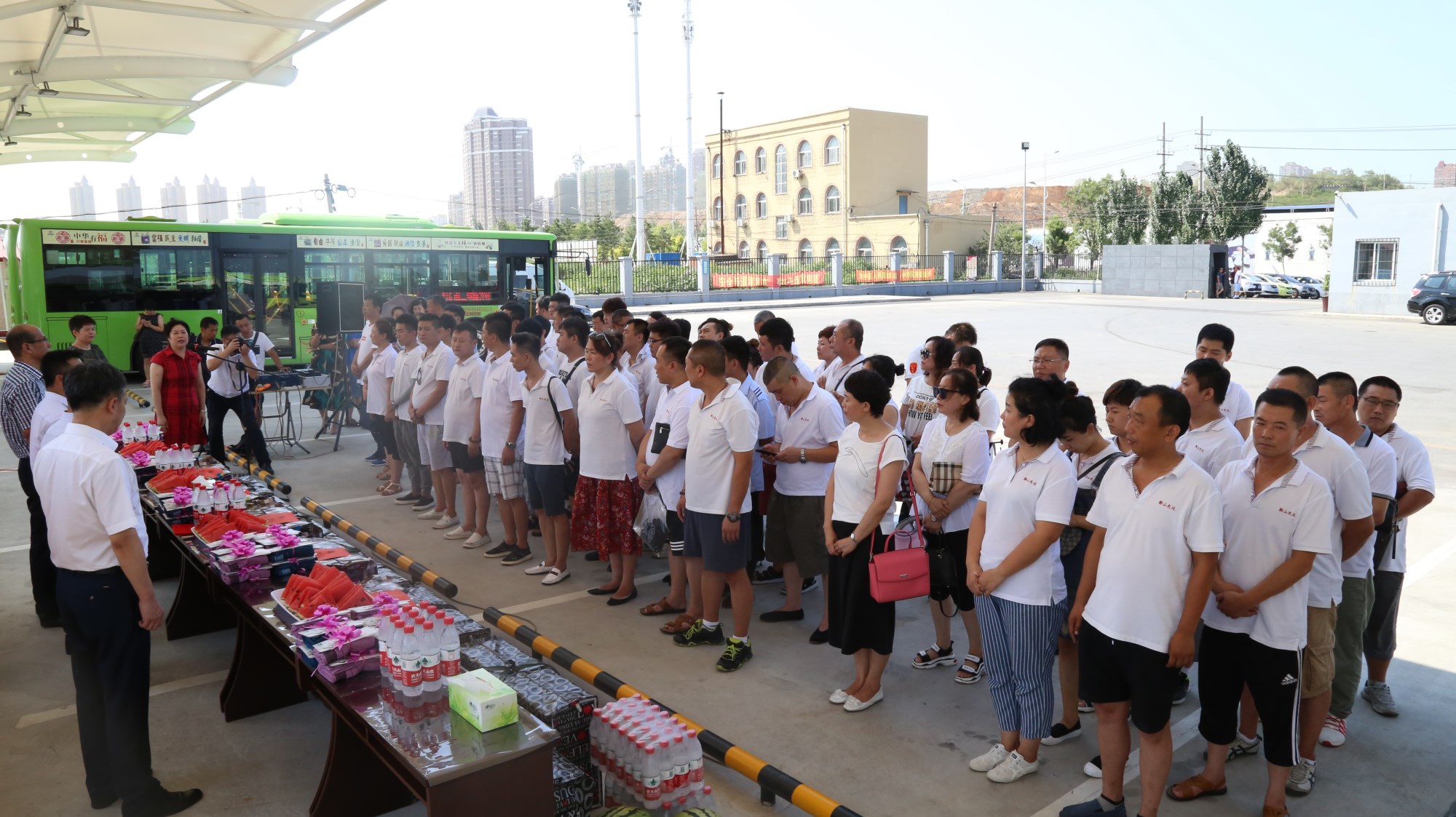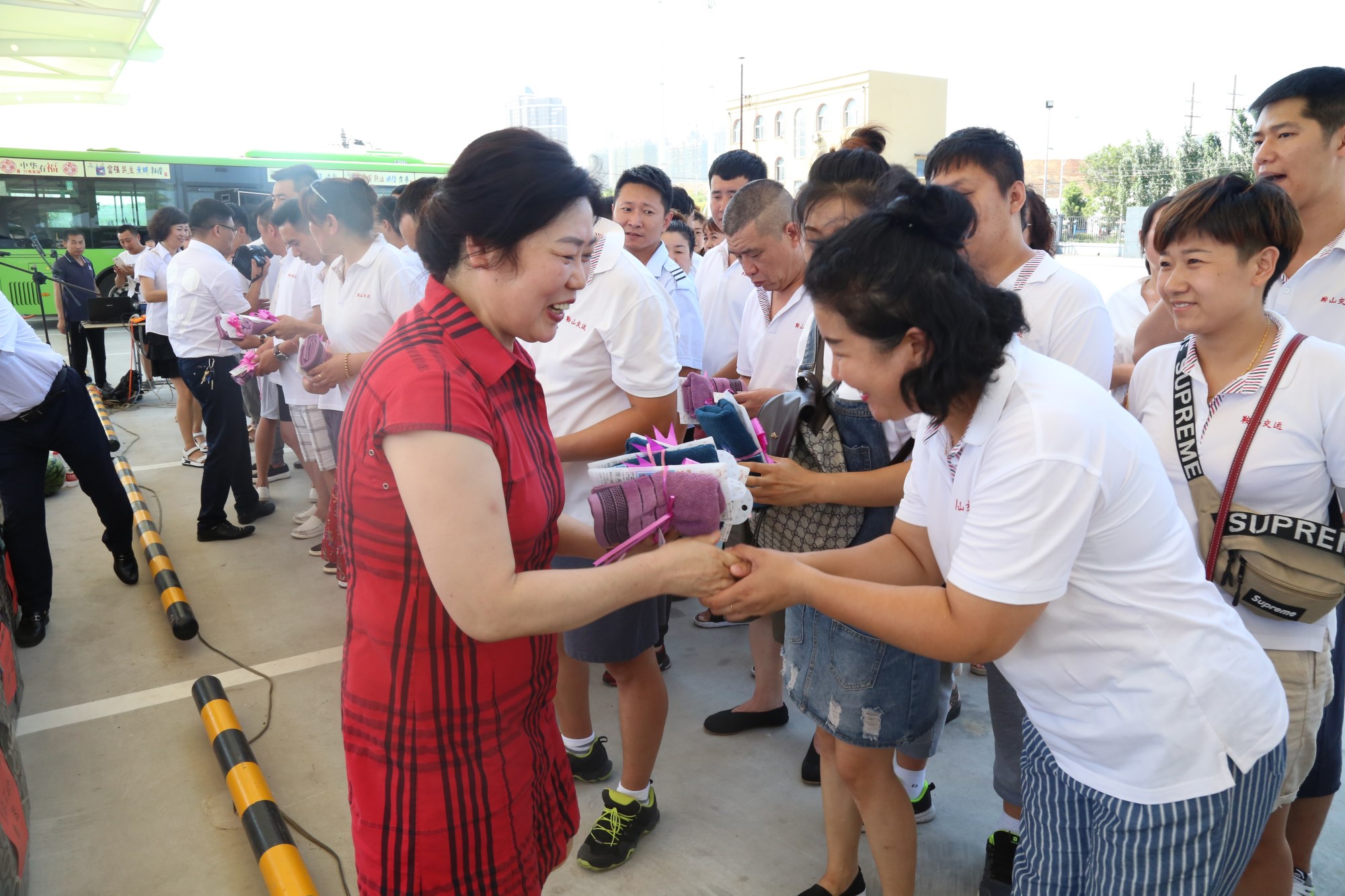 2018年8月1日下午,鞍山市總工會在交運集團第二汽車分公司216路終點站舉行了為公交一線駕駛員送清涼活動。鞍山市人大常委會副主任、市總工會主席解永孚;市總工會副主席李展程;市國資委黨委書記、主任顧洪新等領(lǐng)導來到216路調(diào)度室看望了交運集團一線駕駛員,為他們送去夏日里的清涼與工會組織的慰問。交運集團黨委書記、董事長羅玉艷;總經(jīng)理王春江;黨委副書記、紀委書記、工會主席金秀石出席了活動。活動中,交運集團黨委書記、董事長羅玉艷向市總工會領(lǐng)導介紹了企業(yè)生產(chǎn)運營情況,并代表集團職工向市總工會表示感謝。隨后,市總工會主席解永孚代表市總工會對高溫酷暑中仍堅守崗位、辛勤工作的交運一線職工致以親切的問候,希望交運集團廣大職工繼續(xù)發(fā)揚艱苦奮斗、愛崗敬業(yè)精神,注意防暑和行車安全,以更好的狀態(tài)投入到工作中服務(wù)好市民乘客,并將市總工會撥付的2萬元慰問金交到交運集團董事長手中。第二汽車分公司2路線駕駛員謝金紅在活動中代表一線駕駛員作了表態(tài)發(fā)言。最后,各級領(lǐng)導在現(xiàn)場親手將交運集團工會為一線職工準備了冰袖、毛巾、西瓜、冰鎮(zhèn)礦泉水等慰問物資發(fā)到職工手中。